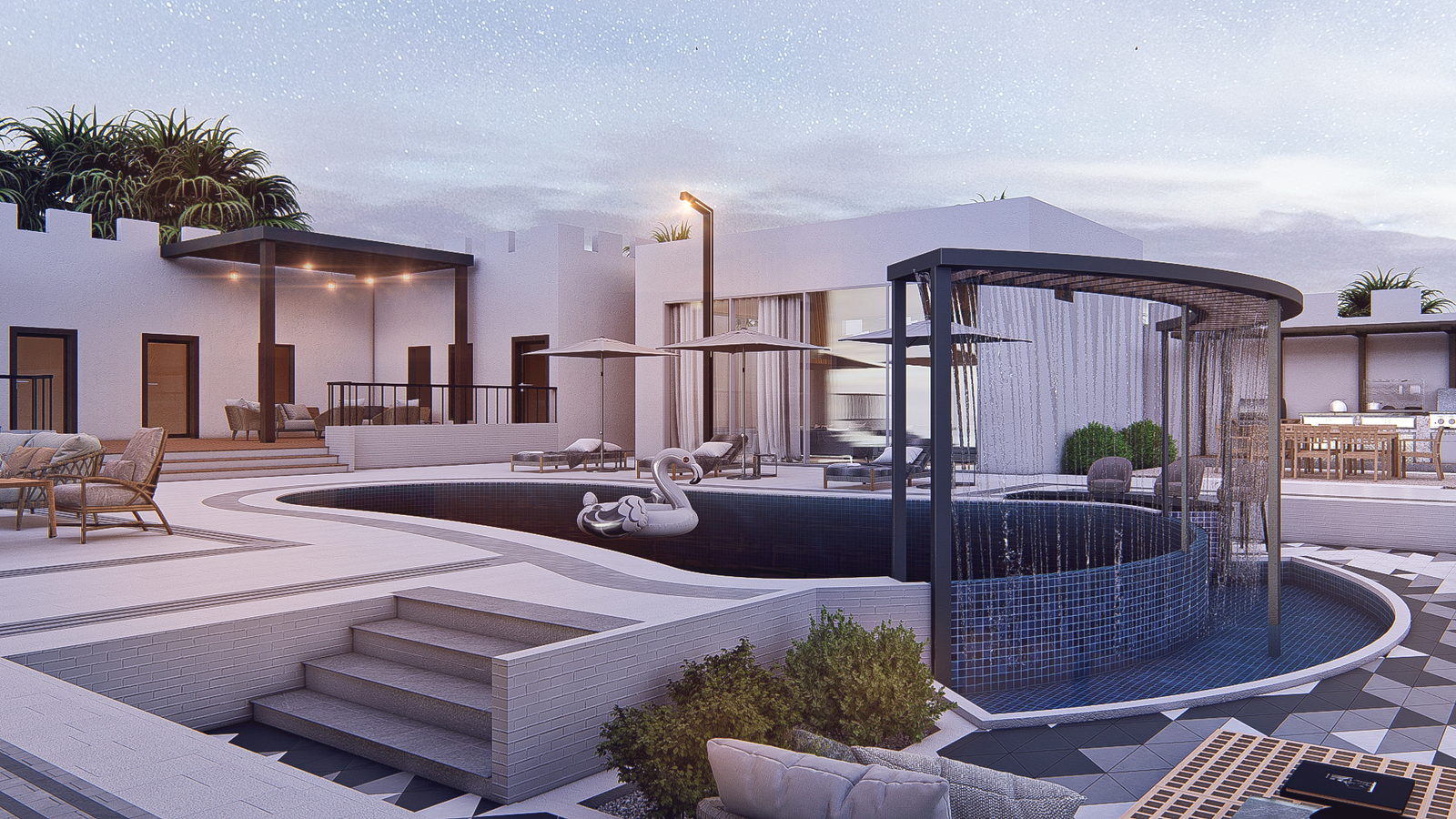 relaxing outdoor space. The curving pool design is the focal point,