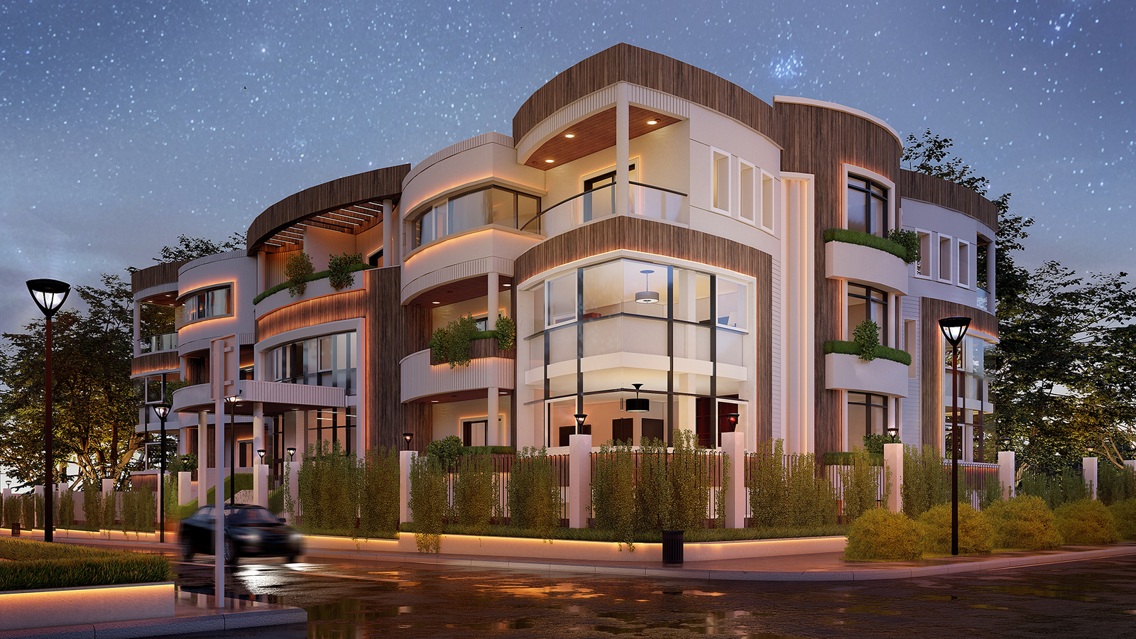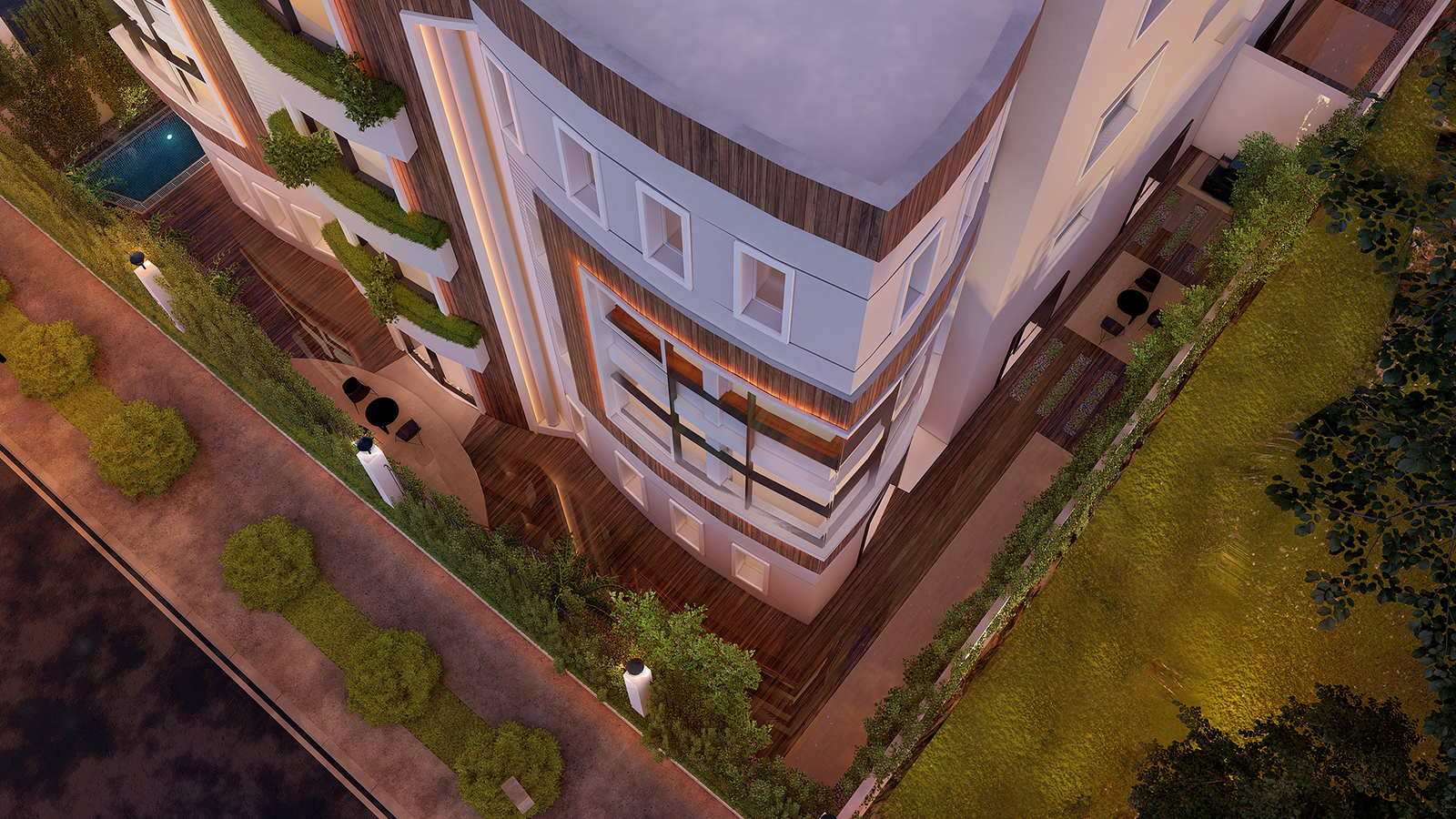 This villa showcases Arcscape’s dedication to creating architectural designs that seamlessly reflect the client’s modern lifestyle and sophisticated taste. The curved façade, accentuated by natural wood textures and soft lighting, combines elegance with warmth. The interplay of glass balustrades and expansive windows invites natural light, while ensuring a seamless connection between indoor and outdoor spaces.