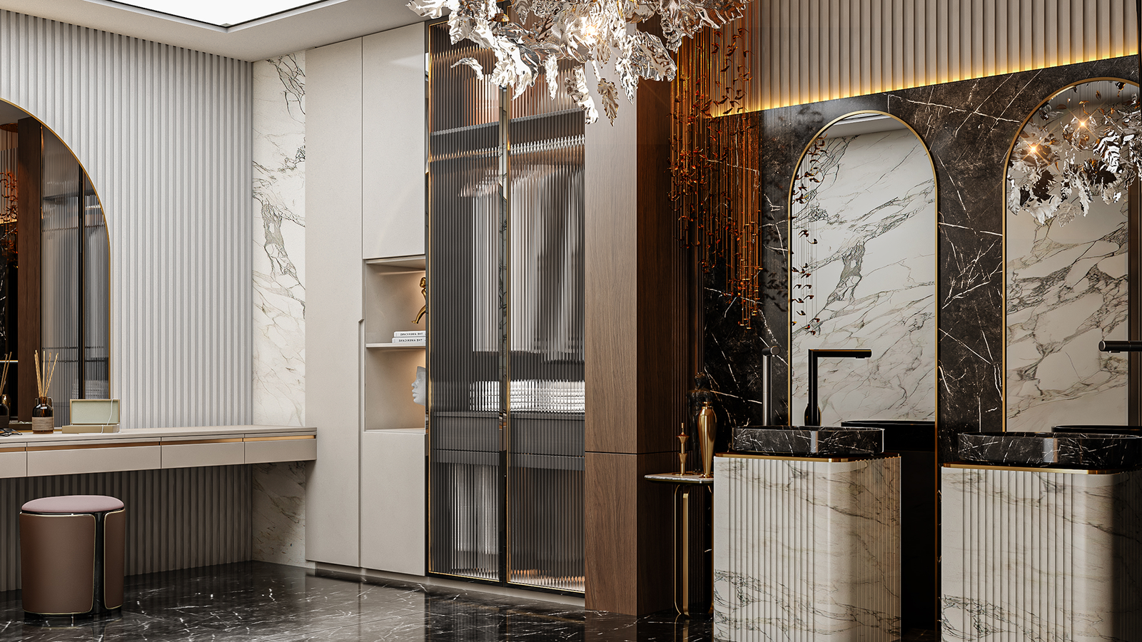 of luxury and refinement. The vanity area, with its marble surfaces