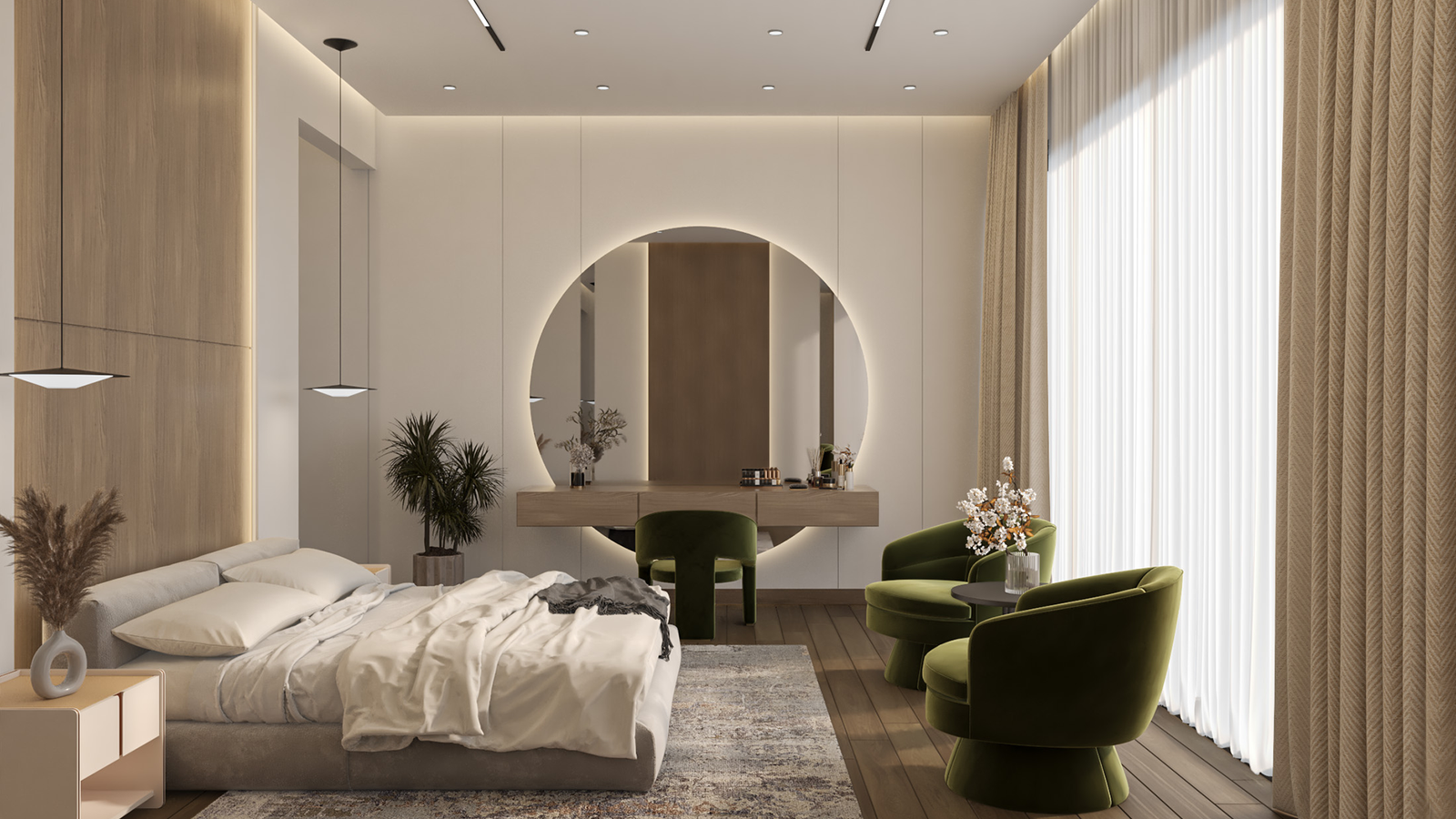 with warm beige tones and natural wood accents. A plush bed