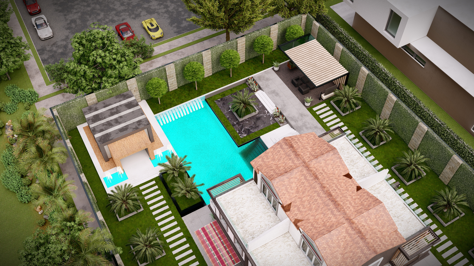 vibrant, exotic atmosphere. A sleek pool serves as the focal point,
