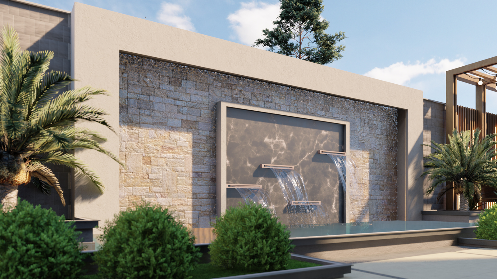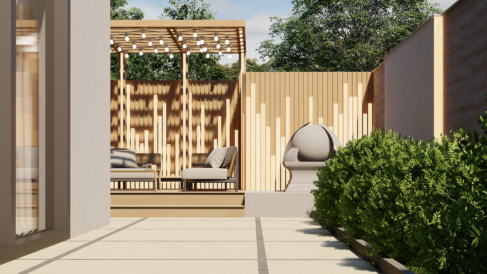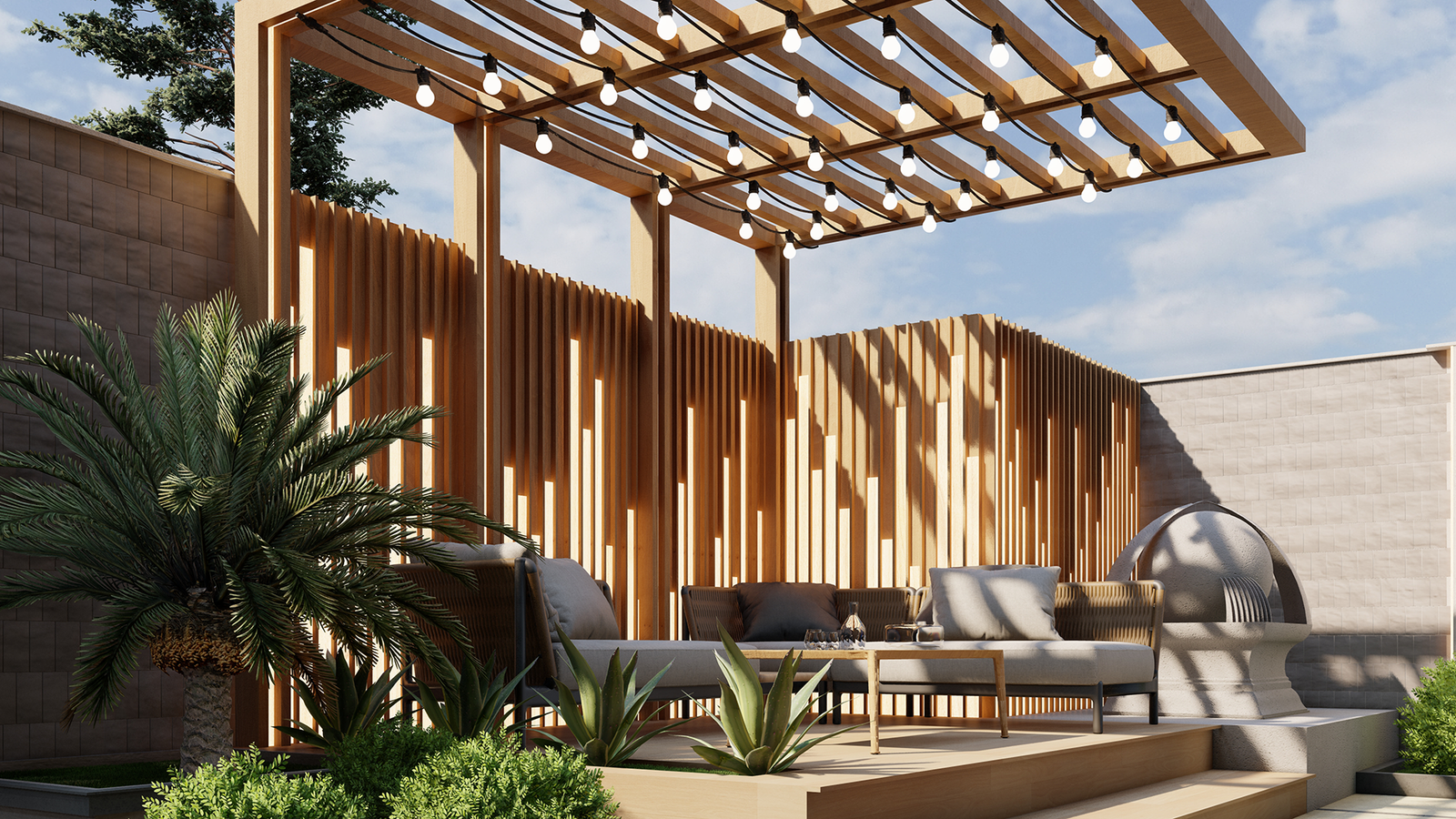 features a wooden pergola with string lights that adds warmth