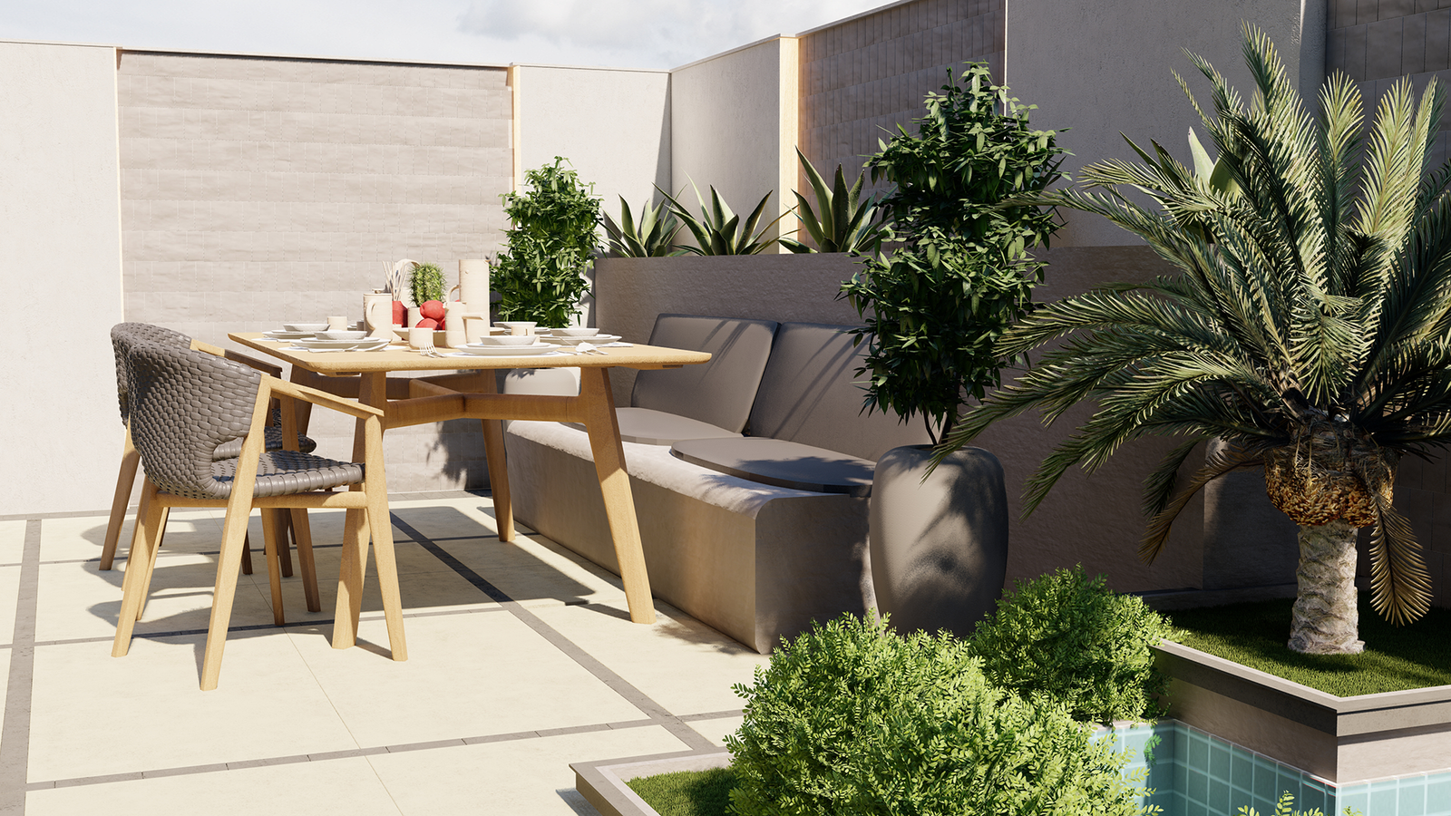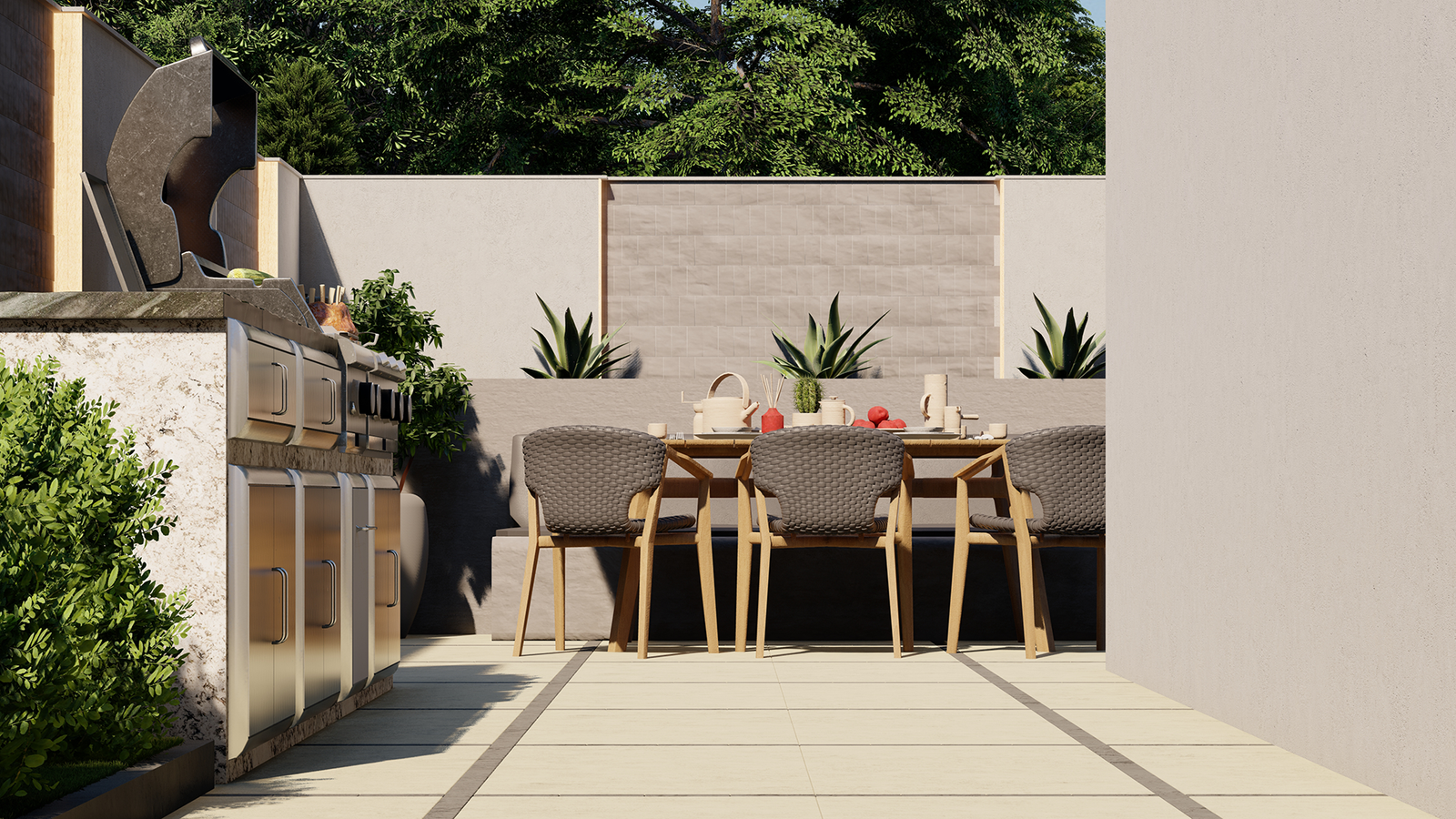 The outdoor furniture, with muted gray tones, complements