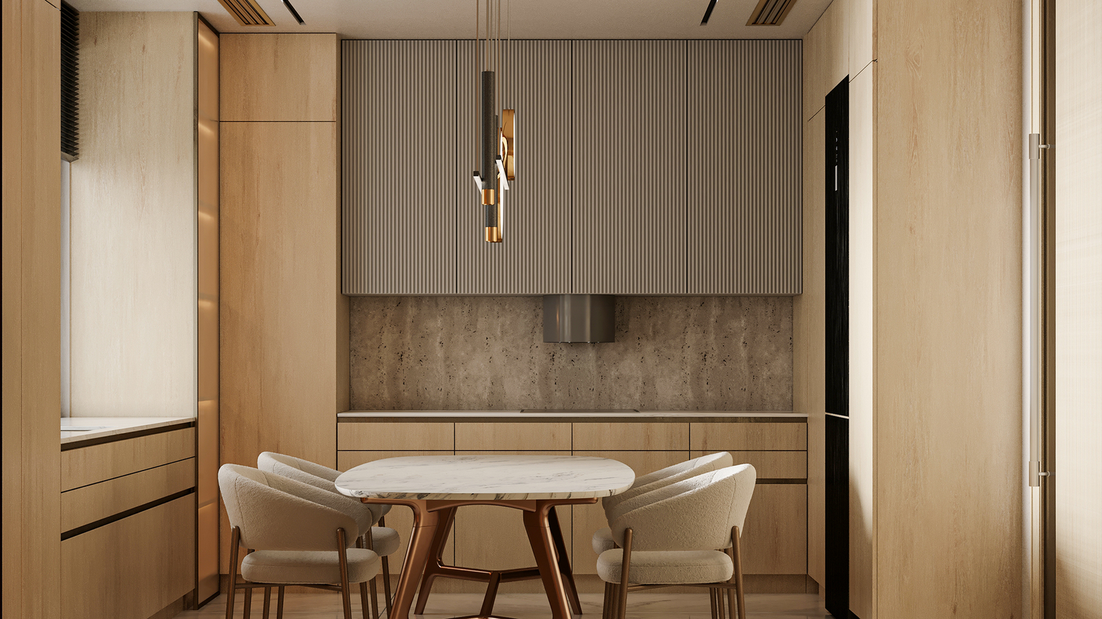 including sleek cabinetry and a textured backsplash, to create a
