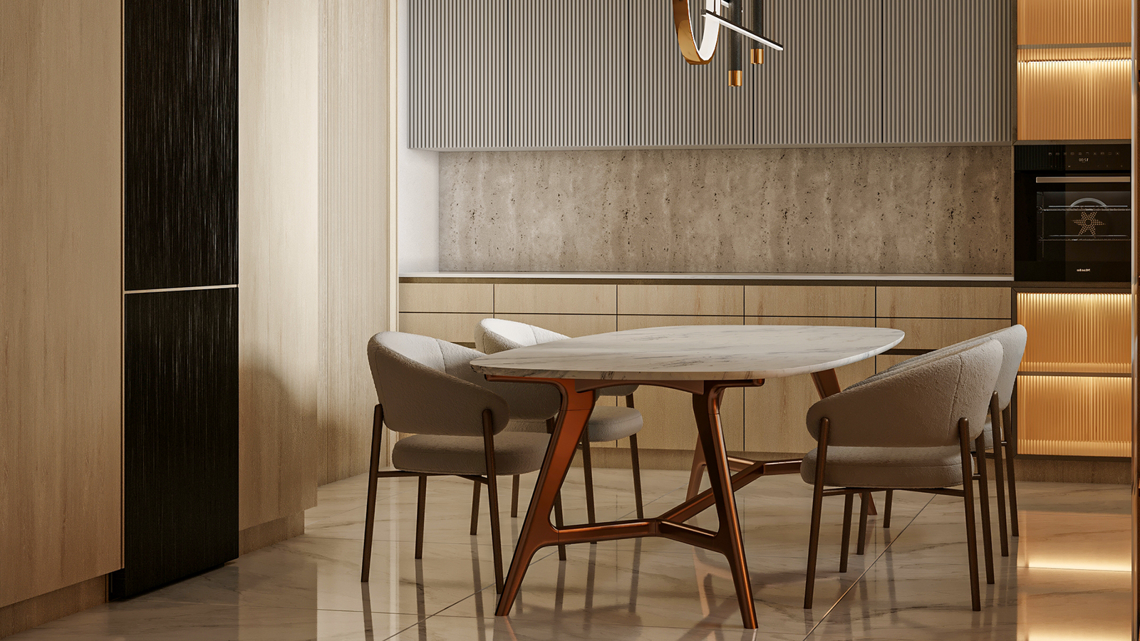 and practical. The marble-topped dining table and soft,