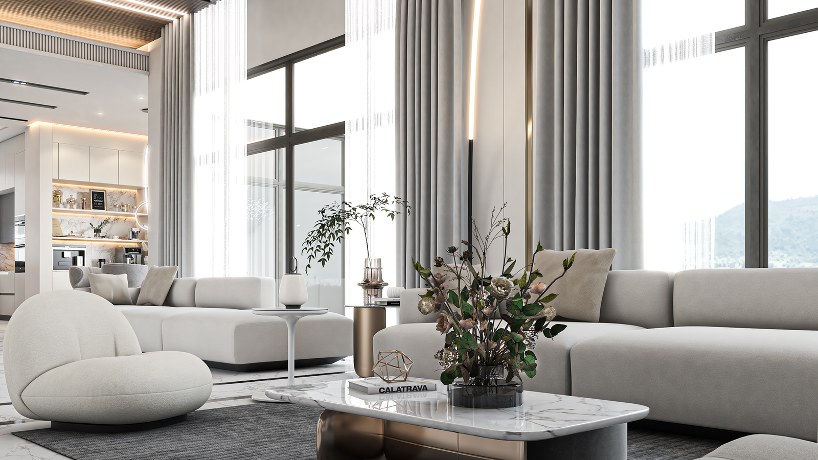 complemented by a low-profile sectional sofa and a sculptural