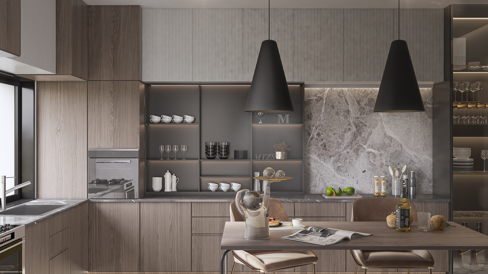 texture and sophistication, while under-cabinet lighting enhances
