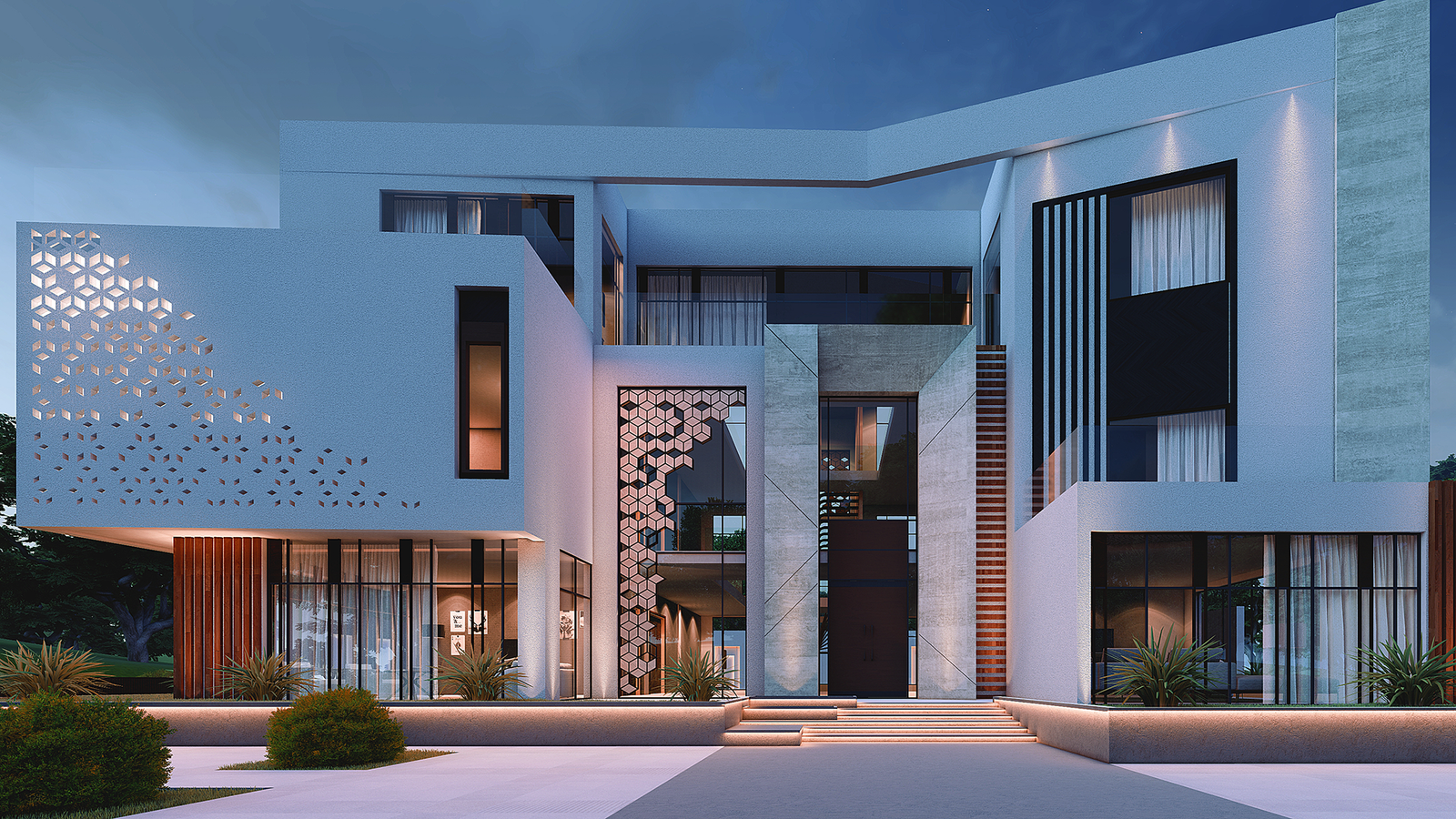 The villa’s symmetrical design emphasizes balance, while recessed