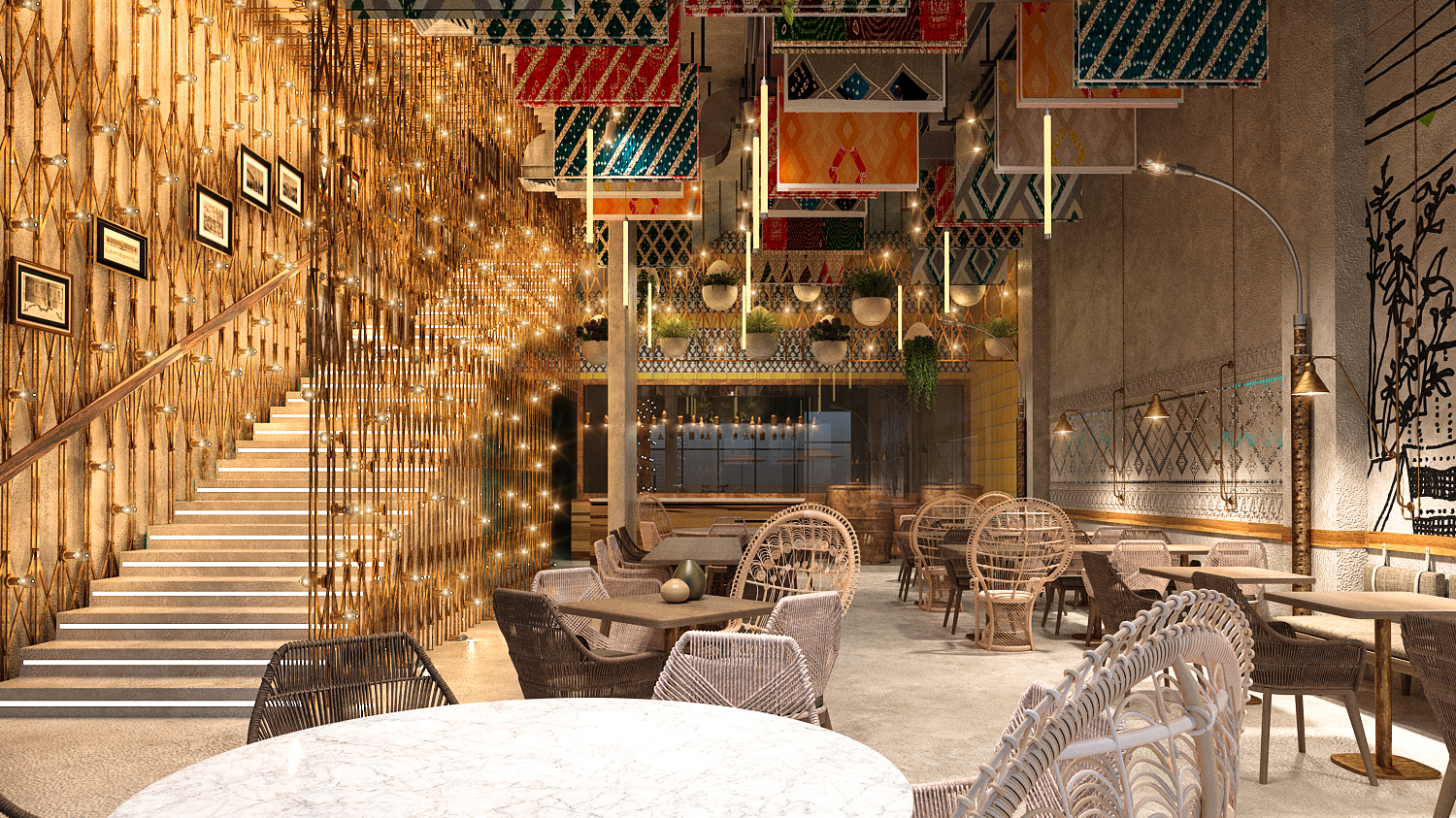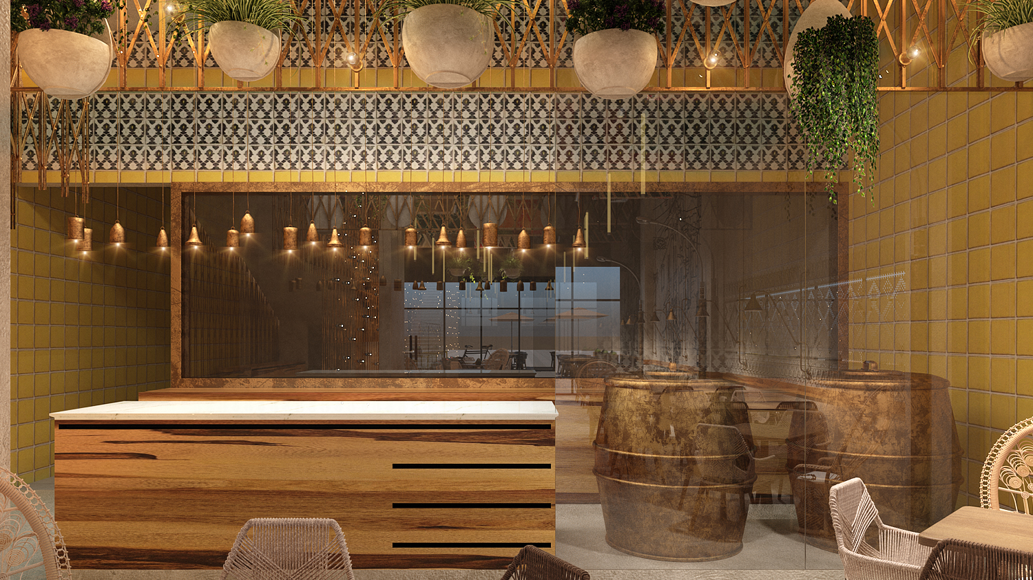 ground-level dining area seamlessly extends outdoors, with