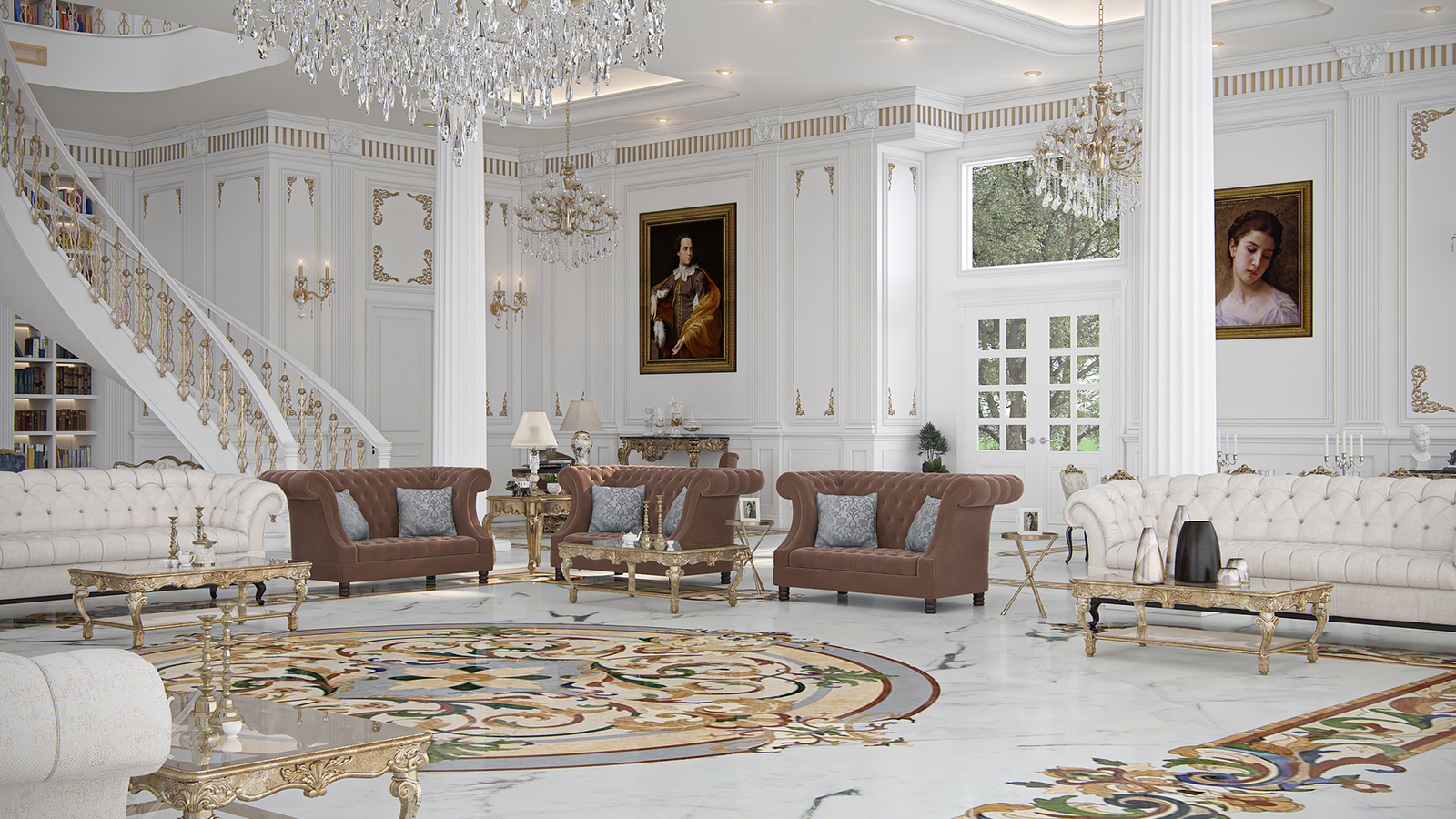enhance the regal feel, while the marble floor’s intricate mosaic
