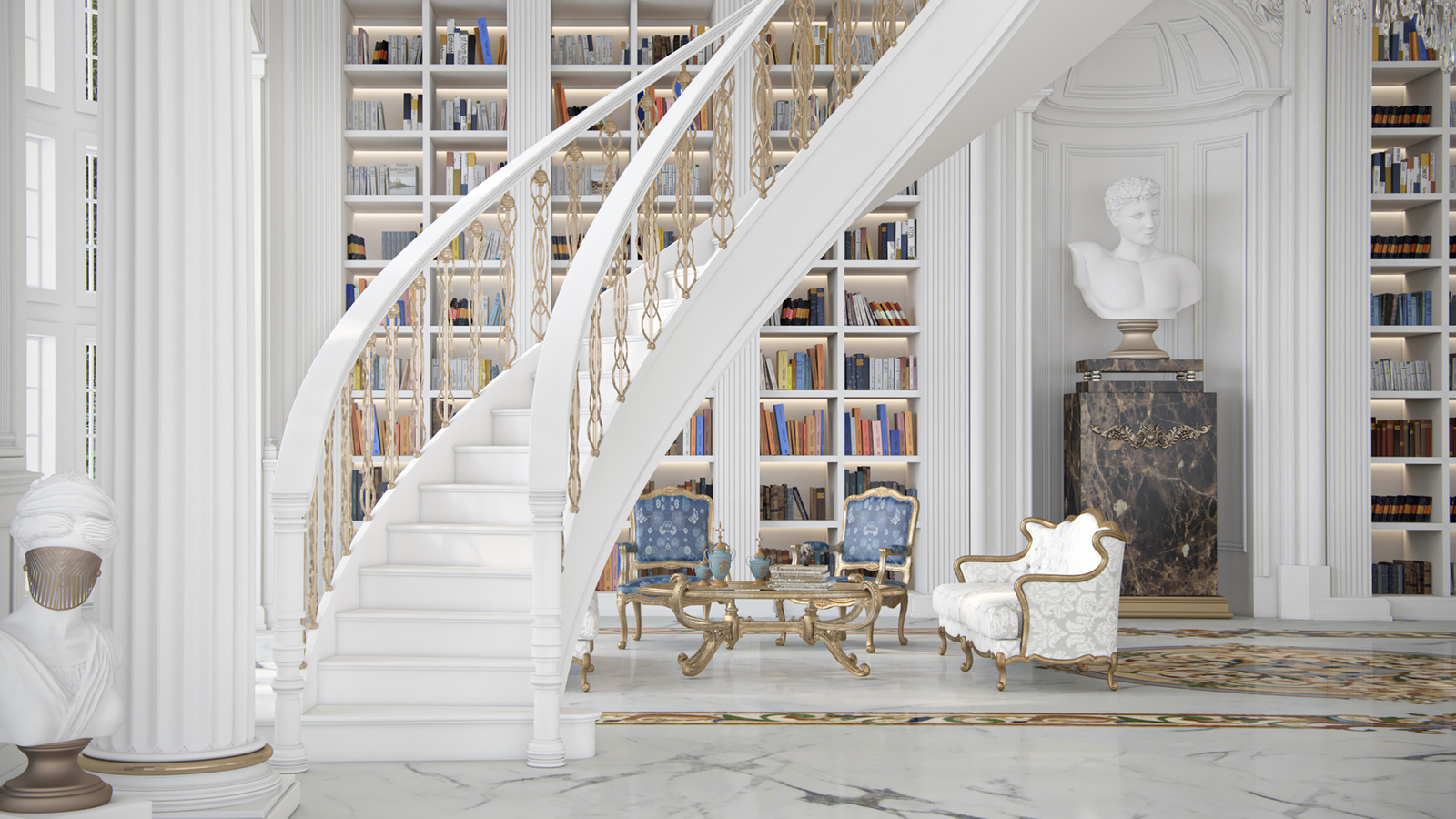statue and towering bookshelves give the space an artistic and