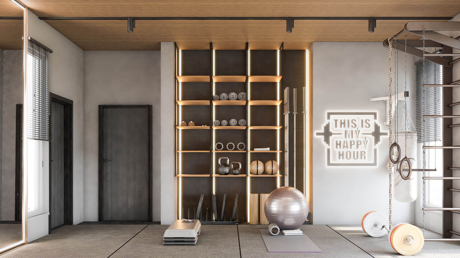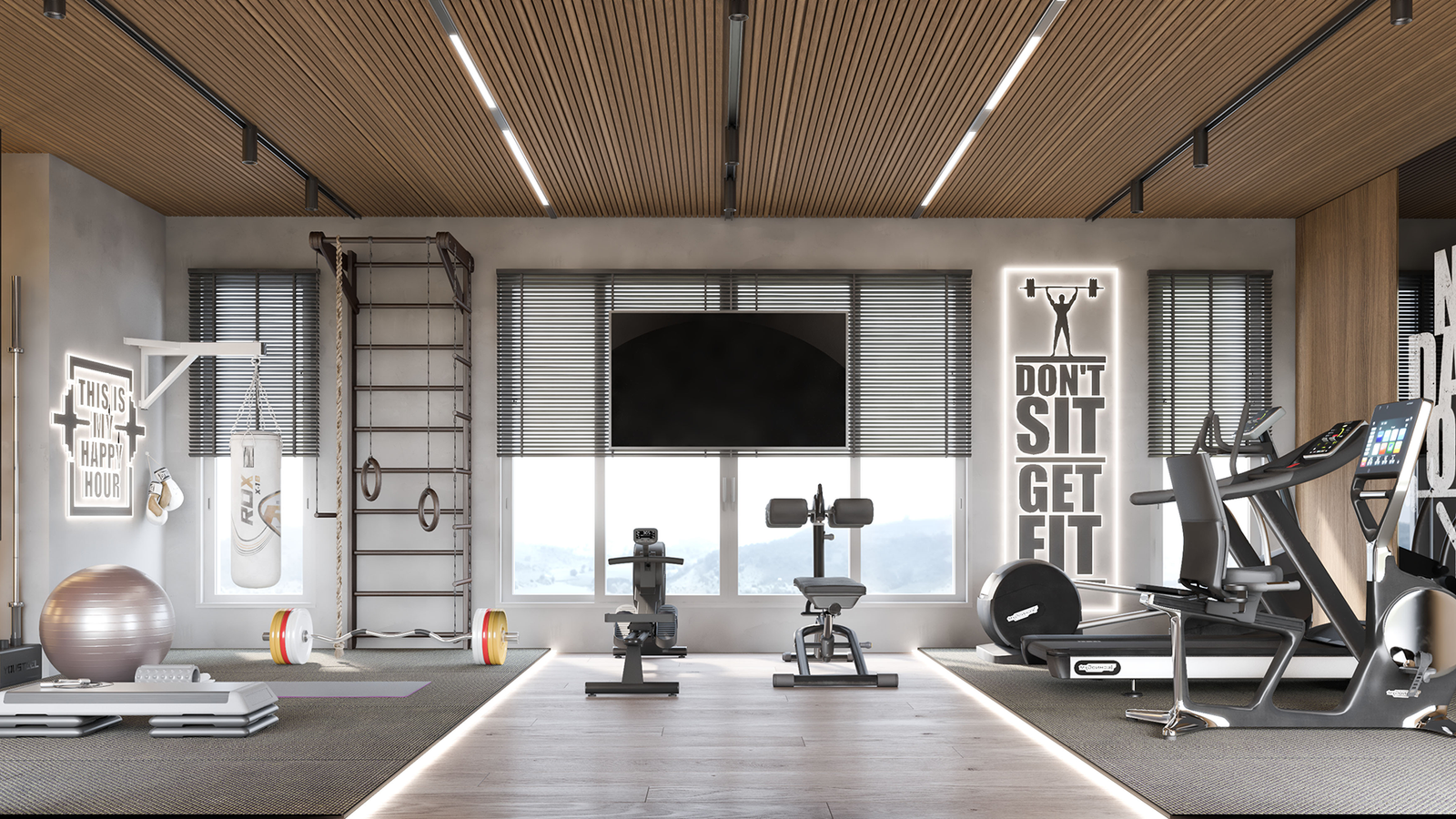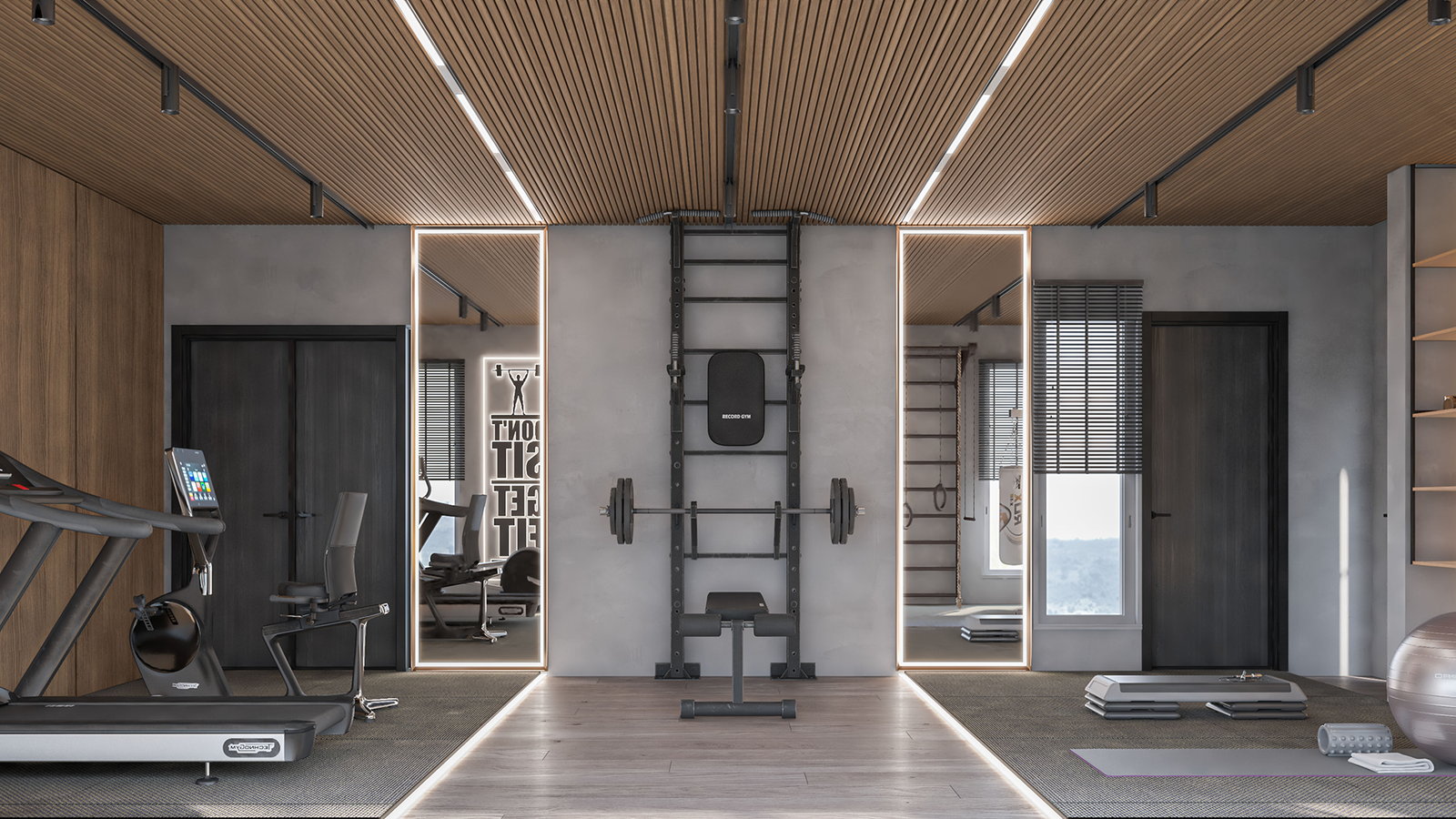 This gym was designed to reflect the client’s active lifestyle while blending functionality with style. The space features warm wood paneling and slatted ceilings for a welcoming atmosphere, complemented by natural light streaming through large windows.