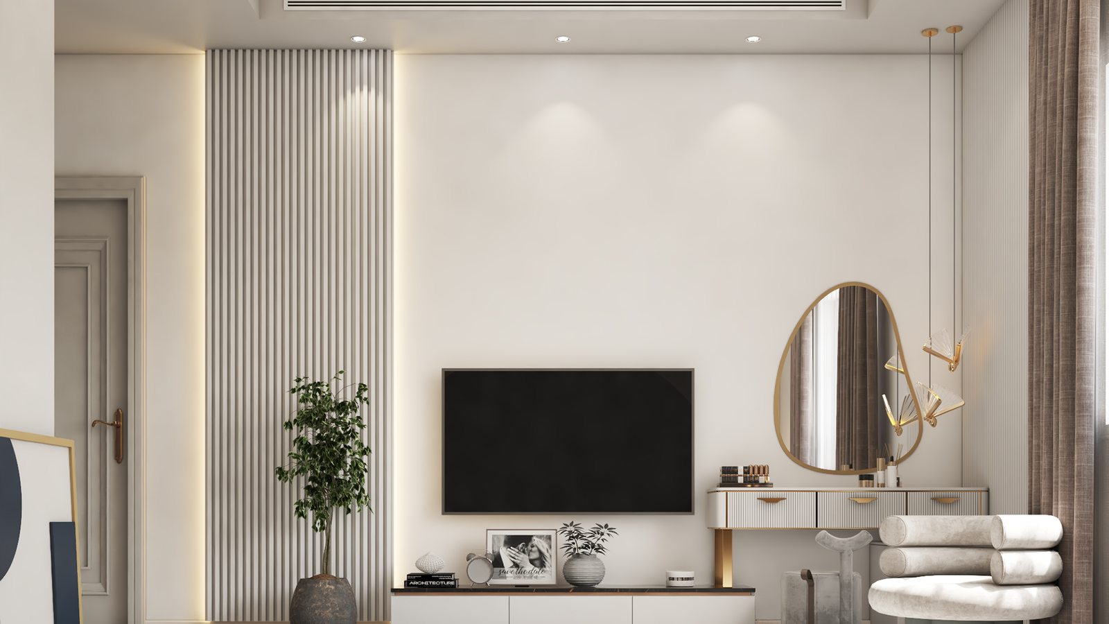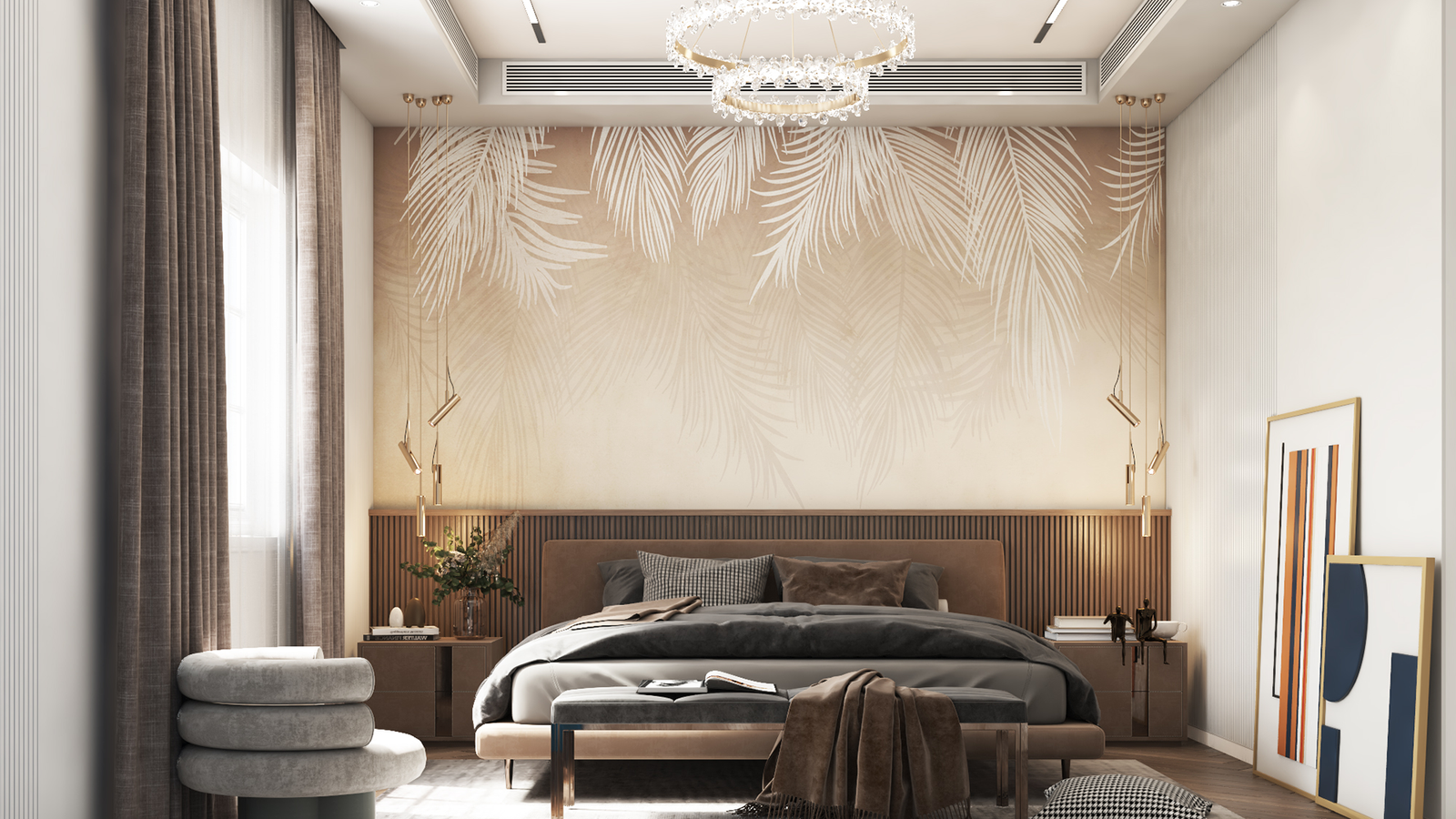 The feature wall, with its subtle palm-leaf texture, adds a natural