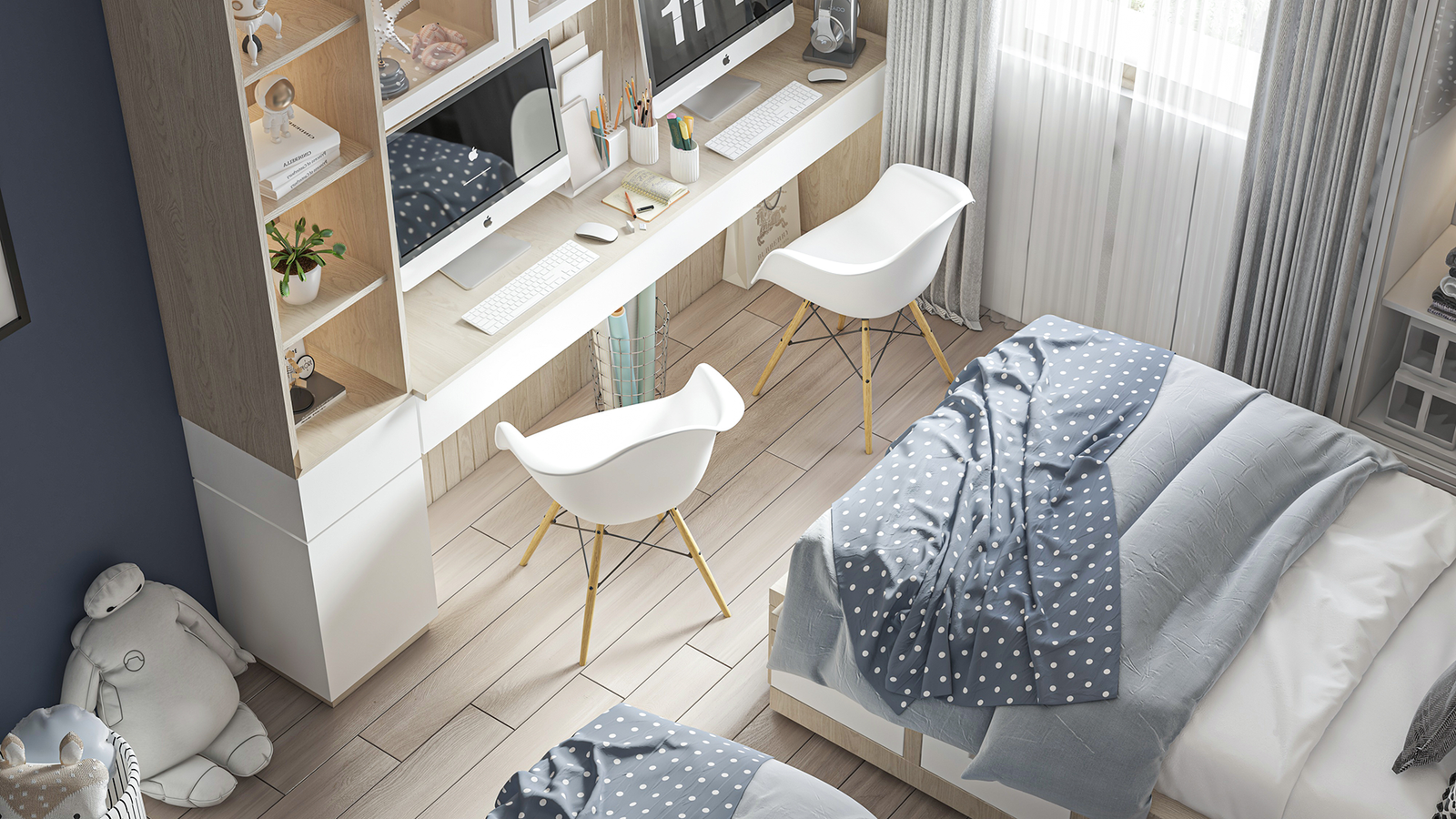 and beiges creates a serene atmosphere, while built-in wardrobes